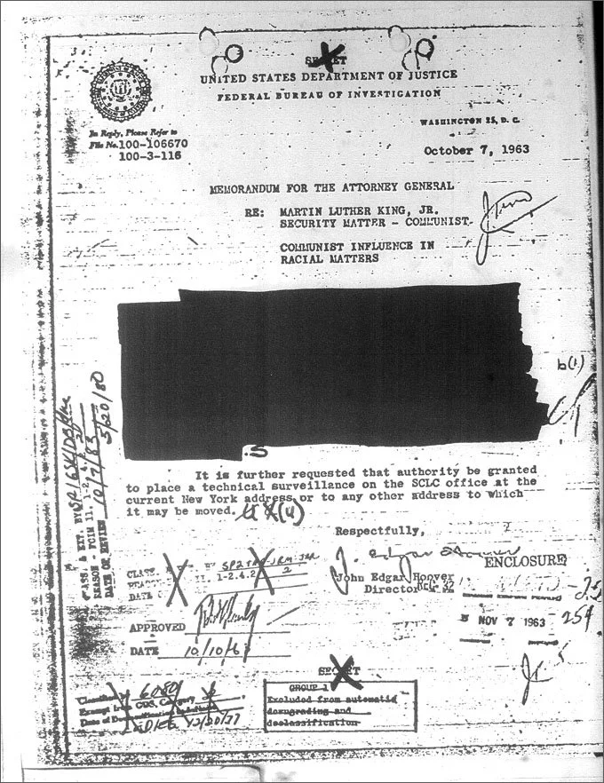In the fall of 1963, Attorney General Robert F. Kennedy approved wiretaps on all of Martin Luther King Jr.’s telephones. The FBI even wrote threatening letters to King with the aim of coercing King to step down from his position as the head of the SCLC.