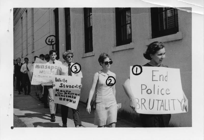 Millsaps students protesting the death of JSU student and civil rights worker Benjamin Brown. Photo shot by the Commission with numbers identifying individual students.